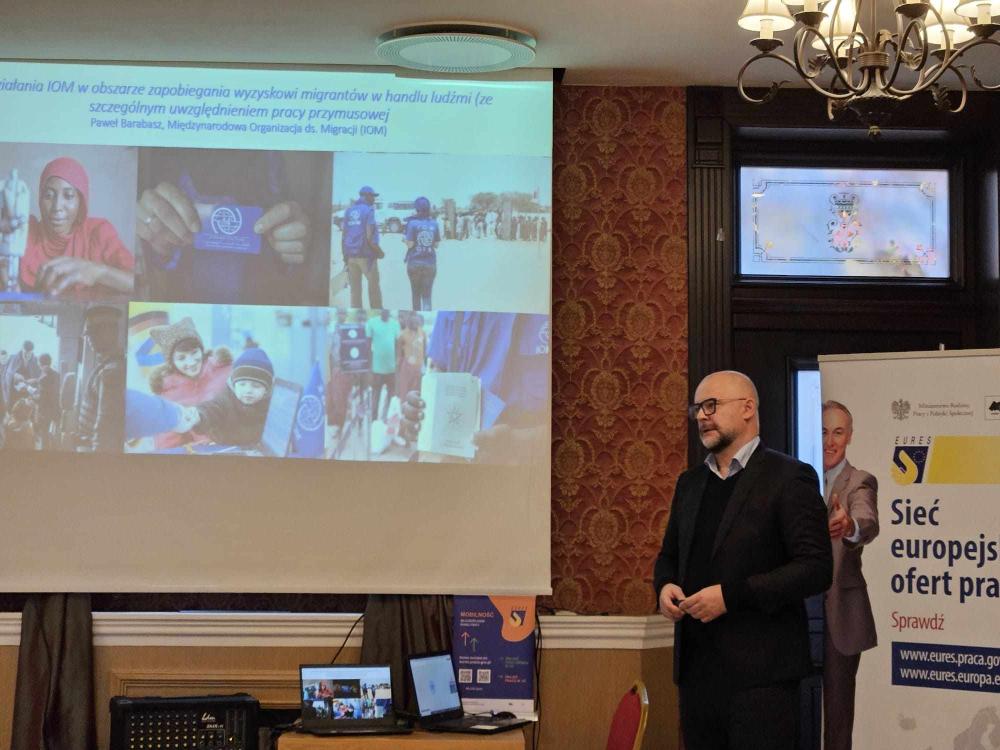W drugiej część konferencji przedstawiciele Międzynarodowej Organizacja ds. Migracji (IOM) – Paweł Barabasz, Anna Szlezinger i Aliaksandra Zhailovich przedstawili działania podejmowane przez OIM w obszarze zapobiegania wyzyskowi migrantów w handlu ludźmi (ze szczególnym uwzględnieniem pracy przymusowej) a także działania informacyjne skierowane do urzędów pracy